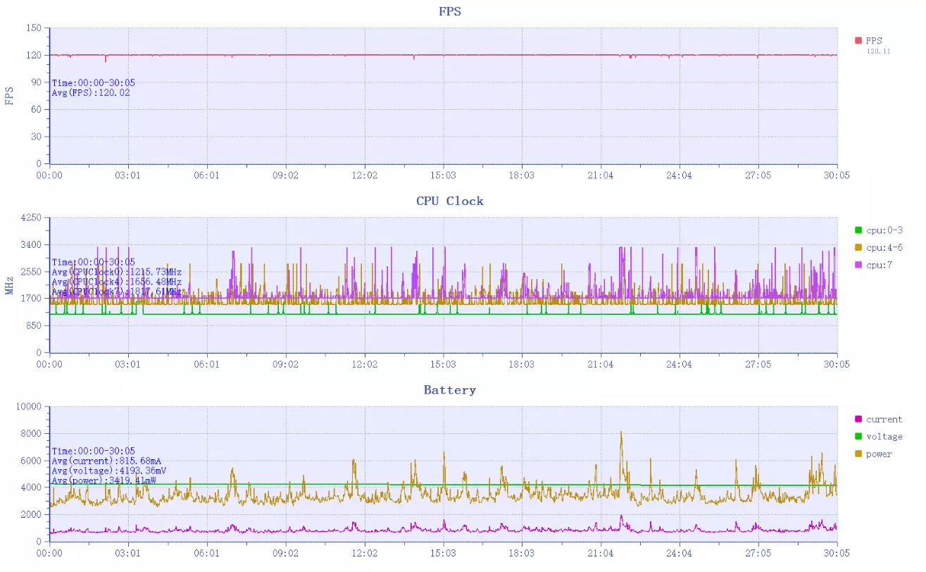 首先是王者荣耀,红米REDMI Turbo 5 Max在极高+原生120帧的情况下进行约半个小时的游戏,整体帧率数据平稳,完全是一条直线的状态,平均帧率120.02帧,1%Low帧117.15帧,最低帧也达到了112.1帧,并且没有任何帧生成延迟,整体体验丝滑。