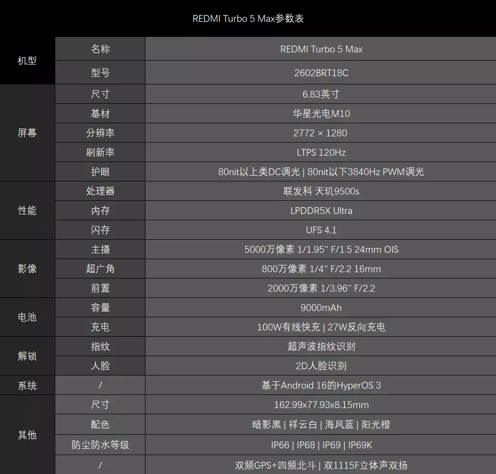 此外,红米REDMI Turbo 5 Max还支持100W快充和27W反向充电,户外能COS一下充电宝,给其他机型应急充电。总结春节前的2500档竞争的激烈程度,大家有目共睹,基本上每一台都是卷王,各方面表现都不错,不过即使如此,红米REDMI Turbo 5 Max也有更出色的地方,一是续航二是游戏表现,这两点在新机里都算得上数一数二。除此之外,红米REDMI Turbo 5 Max在一些外围配置上其实也不错,比如双1115F对称立体声双扬,比如IP66、IP68、IP69、IP69K的满级防尘防水,比如双频GPS+四频北斗的导航配置,当然了,要说缺点也明显,影像部分的竞争力确实不太高。但对影像需求不高的人来说,把REDMI Turbo 5 Max称作2500档手机的版本答案,也没什么毛病。