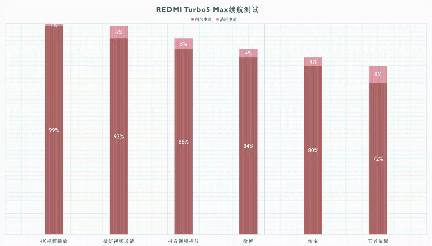 虽然2500档位的机型大多都在影像表现上偏弱,但即使如此,红米REDMI Turbo 5 Max的竞争力对比同价位机型依然显得要弱一点。续航红米REDMI Turbo 5 Max拥有目前小米手机产品中最大的9000mAh电池,甚至超过了一些平板电脑产品。这块电池是世下流行的硅碳负极电池,硅碳含量高达16%,并且备有5年的电池保,在正常使用中基本不用为这块电池担心什么健康度。在实际续航测试环节,红米REDMI Turbo 5 Max的测试环境依然是室温25℃±1℃,WiFi网络,300nit亮度,高性能电池模式,进行本地4K视频播放1小时耗电1%,微信视频通话1小时耗电6%,连续刷高清画质抖音视频1小时耗电5%、连续刷微博1小时耗电4%,连续刷淘宝1小时耗电4%,玩王者荣耀1小时耗电8%,最终剩余电量72%,目前实测续航排行榜第四,日常使用2天1充基本没什么问题。