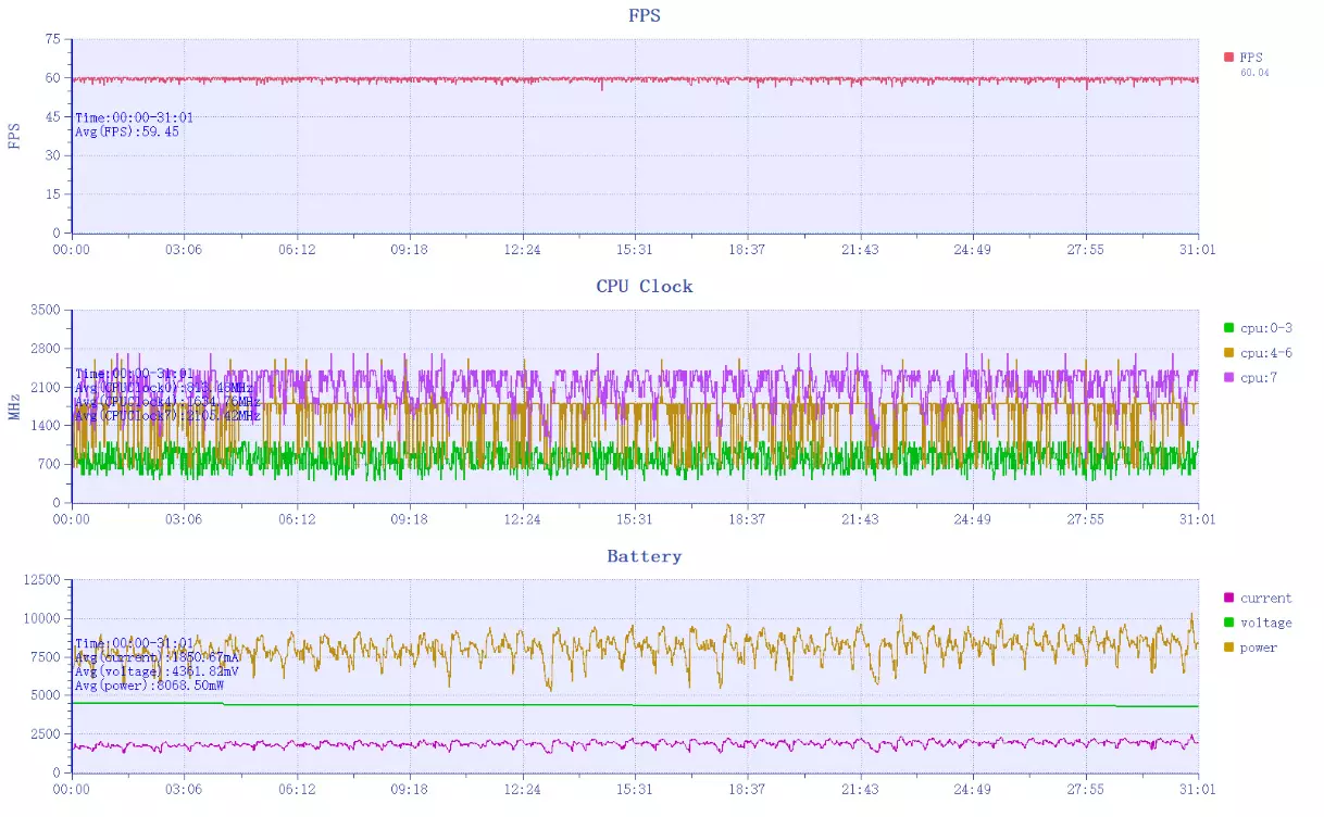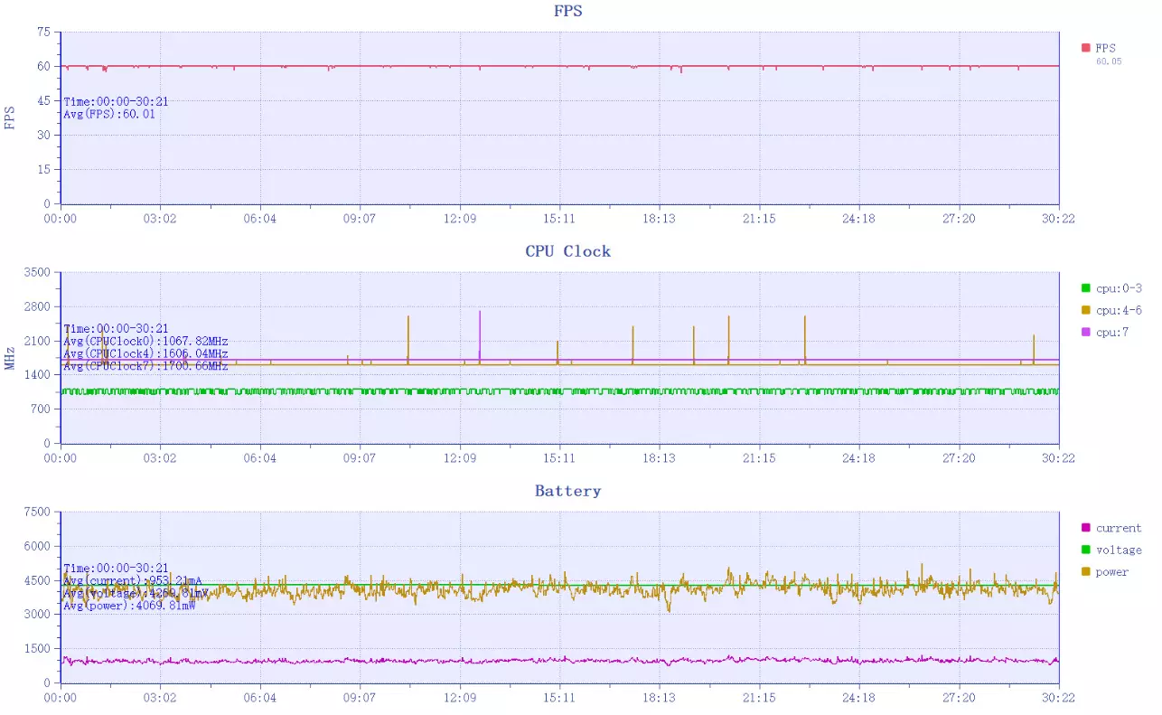 其次是原神,红米REDMI Turbo 5 Max在非常高画质+原生60帧的须弥城半个小时跑图中,数据表现依旧优秀,平均帧率60.01帧,1%Low帧57.93帧,最低帧57,几乎也是一条直线维持到最后,甚至从CPU频率来看,红米REDMI Turbo 5 Max的表现完全游刃有余。