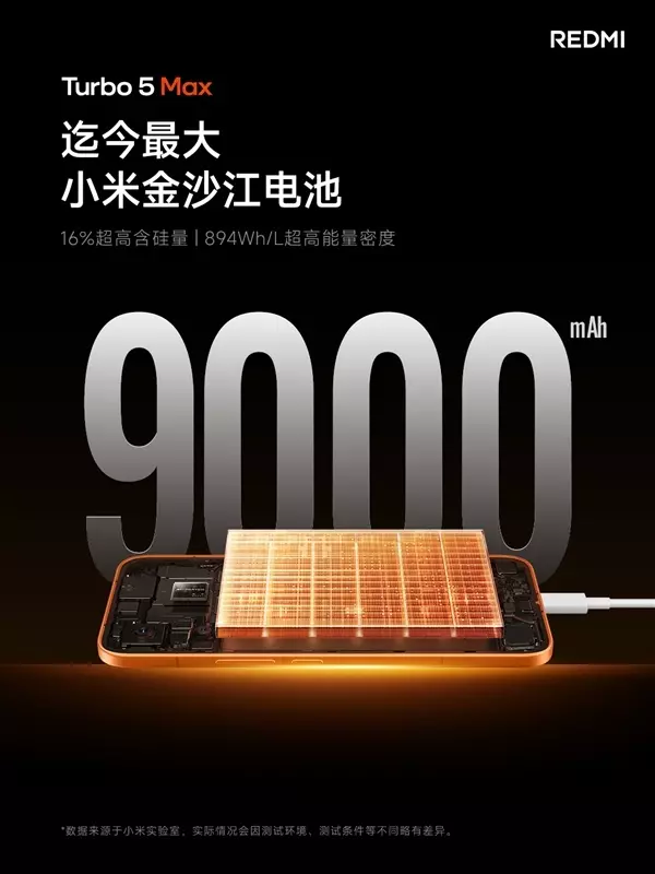 续航体验上,REDMI Turbo 5 Max配备迄今最大9000mAh小米金沙江电池,对比上代容量暴增19.2%,电池能量密度提升至惊人的894Wh/L,是目前小米体系最高能量密度电池。