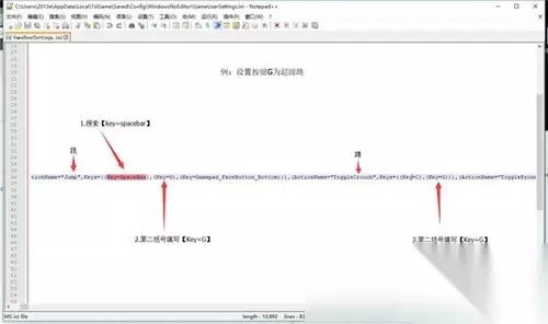 打开文件后通过Ctrl+F搜索【Key=SpaceBar】,在Jump的第二个括号填写【Key=G】(此为设置跳跃和下蹲的键,可以随自己喜好设置),ToggleCrouch第二个括号填写【Key=G】,之后完成保存。