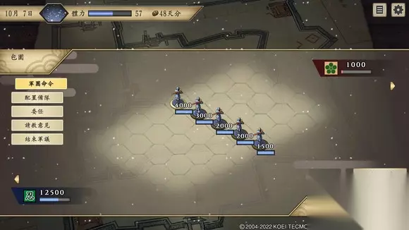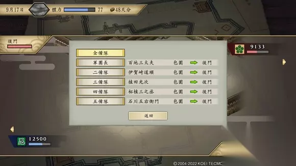 第三步:刷城 1、反复攻打“大和郡山城”。根据游戏的机制,无所属忍者,可以攻城但不能占城。这就给了我们反复刷城的基础 2、对方起初有9000人,但劫掠过后就只有1K。部队朝发夕至,3天返回。5秒一座城 2、除了头几战,一般不用手动部署部队,区别不大,自动就行。 3、若粮草不足,安排高忍术手下抢夺,再训练将练度补回来。 4、拿到智将时,若军学仍没有变星(拿军神的前提条件),可适当手动部署上城门,防止百地看戏过多,不能累积经验。