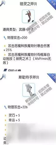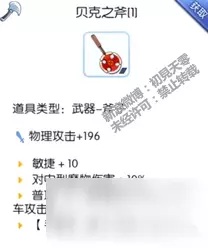 贝克之斧:这是那天发现的新宠,当时挺多人问我贝克斧怎样,基于半龙人卡的火球术,妖道的狂击,邪恶侍者的音投,要念咒,有后摇,等等这些已经对自动技能完全失去信心。但那天测试了一下兽人斧,发现手推车攻击的触发是无念咒,无动作的。这无非是在平砍中带来的一个额外伤害,10级手推车攻击的伤害不低,用贝克斧头不需要学习仍可触发10级手推车,虽然概率只有5%,但是在400%攻速的作用下,触发频率还算可以。而且贝克斧还额外增加手推车攻击的伤害,敏捷还+10,对中型怪还增加10%的伤害,确实是不错的武器之一。由兽人之斧在兽人村升级获得。