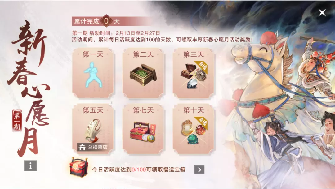“新春心愿月”活动包含两期,第一期时间为2月13日更新完成后-2月27日 05:00,第二期时间为2月27日 05:00-3月13日 05:00。