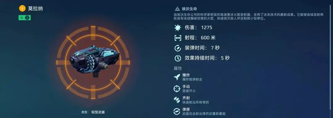 该系列武器属于中程武器,射距600M,其在攻击近距离目标时弹药会正常直线射出,打击中远程目标时则会启用抛物线弹道,越过掩体后命中敌方单位。