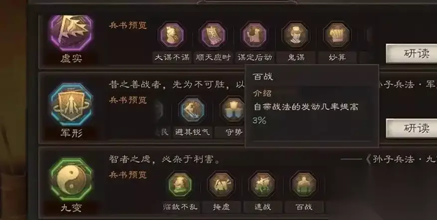 兵书系统的灵活性要求玩家结合战场环境调整选择。面对高爆发队伍时,守势与军形能有效降低于禁被集火的风险;若队伍缺乏控制,速战可提升出手优先级。由于于禁常作为盾兵或骑兵出场,兵种适性也影响兵书效果,例如盾兵阵容中刚柔可进一步强化减伤。兵书并非固定模板,需结合敌方阵容与己方战法链动态调整,尤其需规避与敌方核心战法的冲突。