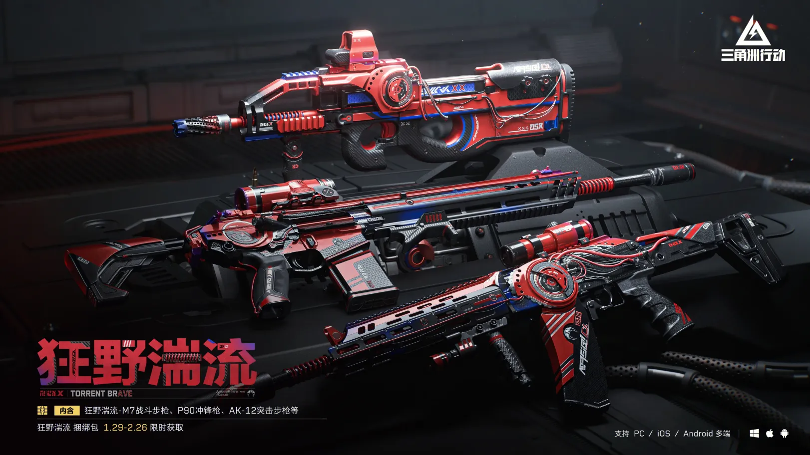 该系列外观包含:【M7战斗步枪-狂野湍流】、【AK-12突击步枪-狂野湍流】、【P90冲锋枪-狂野湍流】、狂野湍流系列喷漆、头像、军牌等多样物品!