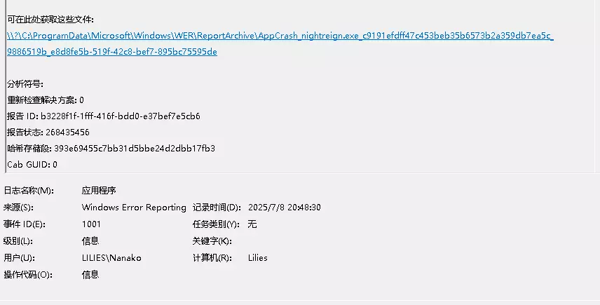 症状 表现为突然毫无征兆的闪退,如同直接杀程序。第一次闪退不知道什么时候会触发,一旦只要触发第一次闪退后,那么后续如果重进游戏便很快触发连续闪退,哪怕什么都不做都会触发闪退。甚至游戏进度条刚加载完就触发闪退。只有重启电脑才能解决高频闪退问题。但是依然不知道什么时候会触发新一轮的第一次闪退 网上许多解决办法,要么是关QQ、改成utf-8、把无边框改成全屏,实际上,至少我这边都没有用,而且它们最后一步都有个重启电脑,重启后是有一段时间不会闪退,但最终还是会触发。 要么就是卖加速器的。这一眼都不是网络问题(如果是网络问题在游戏过程中就会感到丢包,而不是流畅的玩着毫无征兆的闪退,况且如果是网络问题也会正常程序退到初始页面,而不是跟alt+f4似的毫无征兆地程序暴毙,十个闪退解决方法八个卖加速器,把人当傻子么) 思路 猜想第一,闪退是小蓝熊的问题。很容易证实,脱机游戏一点问题都没有。但是,总归还是想联机玩对吧。 第二,网上的许多无效解决方案有一个共同点就是重启电脑,重启电脑有一个共性就是释放内存。很有可能是某种错误写入内存,被小蓝熊检测到,被误认为非法操作进而中止游戏。而这个错误不太可能是出自游戏自身,因为游戏中止后会释放自身占用内存。更可能是来自后台运行的服务或者系统,游戏虽然中止了,但有问题的那块内存还在利用着,所以第二次开游戏时候小蓝熊再次检测到那块内存,很快又闪退了。 而电脑重启后全局释放内存,所以这次能玩很久。然而治标不治本,根源问题没有解决所以过段时间还会闪退。 排查 Win + R 输入 eventvwr.msc 回车,左侧选择 Windows 日志→ 应用程序,找到闪退时间的系统日志