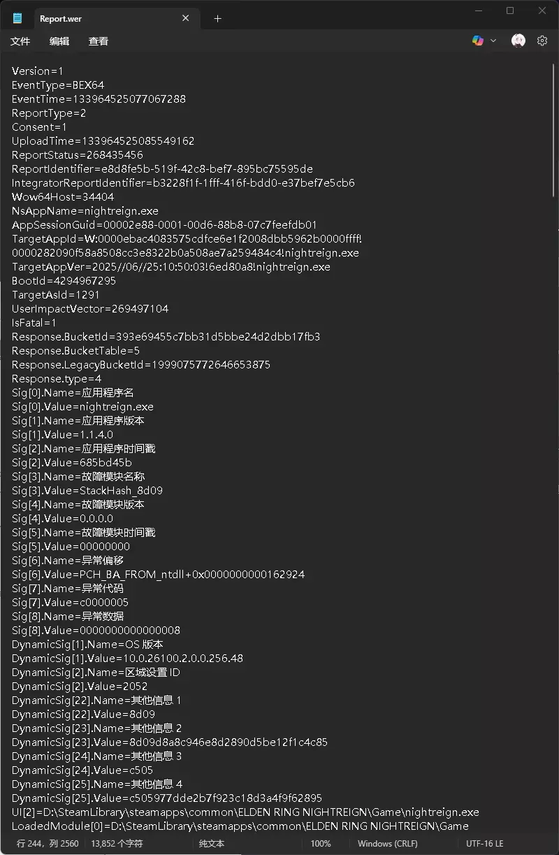 报告比较长我就不完整放了,关键信息就这么两句: EventType=BEX64 异常代码:c0000005 故障模块:StackHash_8d09 异常偏移:PCH_BA_FROM_ntdll+0x162924 BEX64 这是个在拦截非安全代码或注入行为时的一个异常类型,比如非法写入到只读或无权内存区域、第三方DLL注入导致崩溃、程序执行了从堆栈读取来的地址,但该地址是无效的(比如栈损坏),总之表示缓冲区溢出异常,典型的内存问题,证实了之前的猜想。 c0000005 前面写了,表示缓冲区溢出、空指针解引用等 StackHash_8d09 意思是“堆栈哈希崩溃”,并且崩溃点不在特定模块,而是出现在一个经过ASLR地址随机化的地方,大多时候这种堆栈哈希错误是由外部DLL注入或栈破坏导致的 PCH_BA_FROM_ntdll+0x162924 这个标识有两个部分: PCH_BA_FROM_开头说明此地址是从预编译头文件(PCH)中恢复的代码地址,也可能是优化编译过程中转义的异常地址 ntdll.dll是Windows最底层的用户态系统库,通常程序不直接调用,崩溃发生在ntdll.dll内部,说明是调用系统 API 时触发的错误。 小蓝熊在一次崩溃后会显示错误代码,我的是Error 30005,可以在它们官网查询这个错误代码的具体含义: