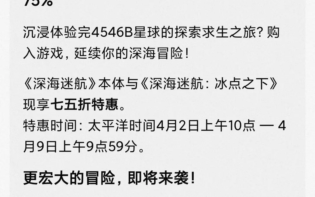 更深的海,更大的利维坦,更多样化的载具,请一同欣赏首次公开的《深海迷航2》游戏实机预告! ------- 【有关《深海迷航2》抢先体验版发售延期通知】 Unknown Worlds 团队正努力开发本作,但为了确保能给玩家们足够难忘的下潜经历 ——我们决定将《深海迷航2》的抢先体验版本延期至 2026 年 游戏的方向与制作团队都不会发生任何变化,我们对目前的开发成果充满信心——只是想在抢先体验首发时,能带来更丰富的内容和更完整的体验。 为了展现我们的信心,也请一起欣赏这段首次公开的游戏实机预告。 而在这其余的时间里,我们将有更多时间加入: ■ 更丰富生态系统 ■ 更多样的载具升级 ■ 新的工具与玩法机制 ■ 更具深度的故事线 ■ 更多待发现的海洋生物 ------- 大眼仔在这里感谢中国玩家对《深海迷航2》的热爱与支持! 也感谢你们的耐心等候! ------- 更多信息,可查看:https://unknownworlds.com/en/news/subnautica-2-coming-2026