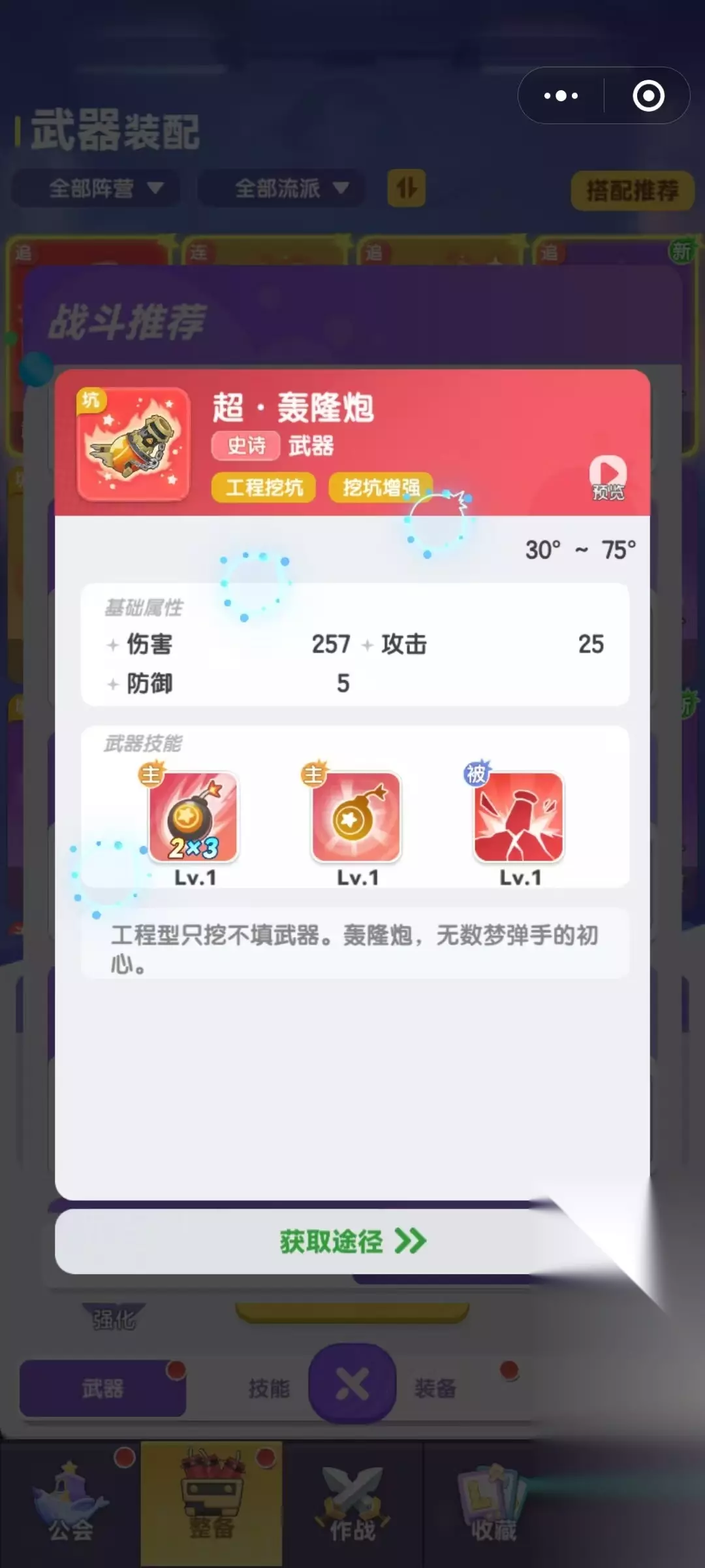 星红武士是这套体系的节奏核心。它以6发子弹打击为主,单颗子弹伤害中等偏低,但胜在命中频率高,使用时还附带核爆值的效果。核爆值机制是挖坑流派中特别关键的一环,它决定了敌人是否会在后续受到更大范围的地形破坏或状态限制。在战斗初期叠加核爆值,为后续的控场做铺垫,能够有效打乱敌方阵型。 最后是轰隆炮,它作为挖坑流派中的控制核心,提供的是稳定的多段打击与控制力。其发射的6颗子弹,虽然伤害数值略低,但每次命中敌方目标时有20%的概率施加“禁锢”状态,持续1回合。禁锢可以阻止敌人移动甚至释放特定技能,在实战中无论是追击残血、阻止敌方输出还是打断关键连段,作用都极其明显。如果前期通过星红武士已经堆出核爆效果,再配合轰隆炮的禁锢和多发覆盖,极容易形成一次稳定的控场连锁,压缩敌方走位空间,从而限制其战术发挥。