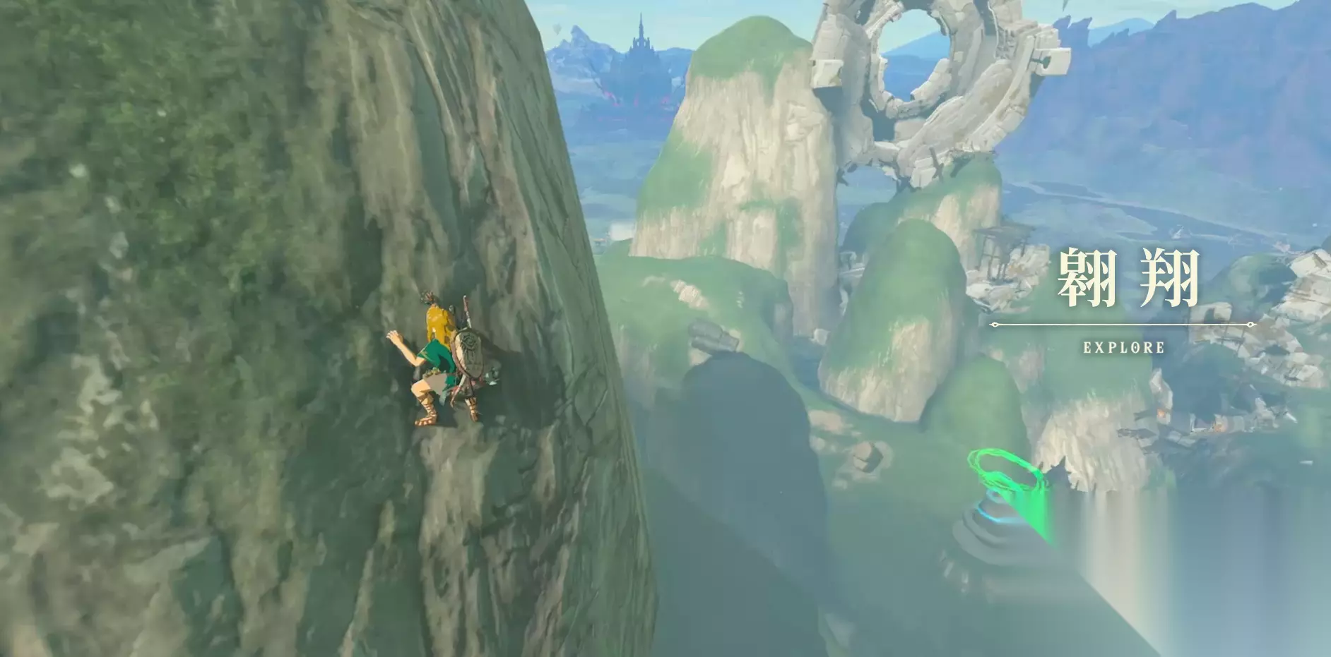 3、到达后,将刚才站的平板使用究极手将其连接在上面,使用武器,打绿色柱子即可将球击中左边的黄圈中。