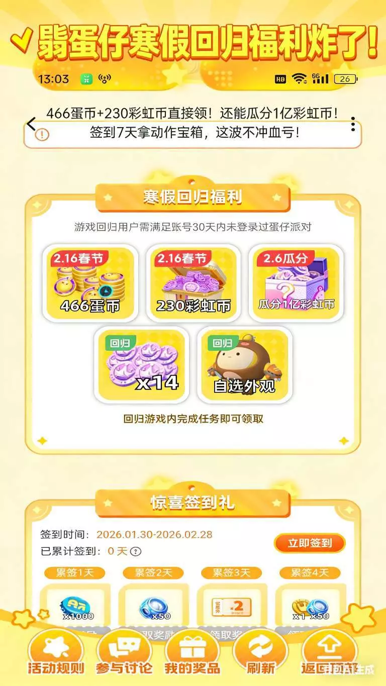 #233乐园你真的听劝 1. 🎁蛋仔寒假回归福利炸了!466蛋币+230彩虹币直接领!还能瓜分1亿彩虹币!签到7天拿动作宝箱,这波不冲血亏!