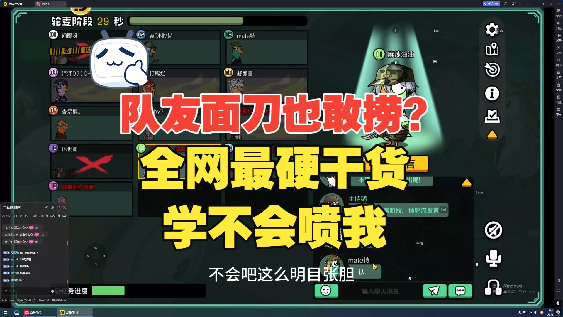 这是一场鹅鸭杀13人进阶场的对局,玩家拿到呆呆鸟角色,轮麦阶段里,有玩家踩警长,警长淡定应对,还有法医参与发言,玩家们各述情况,场面趣味十足。