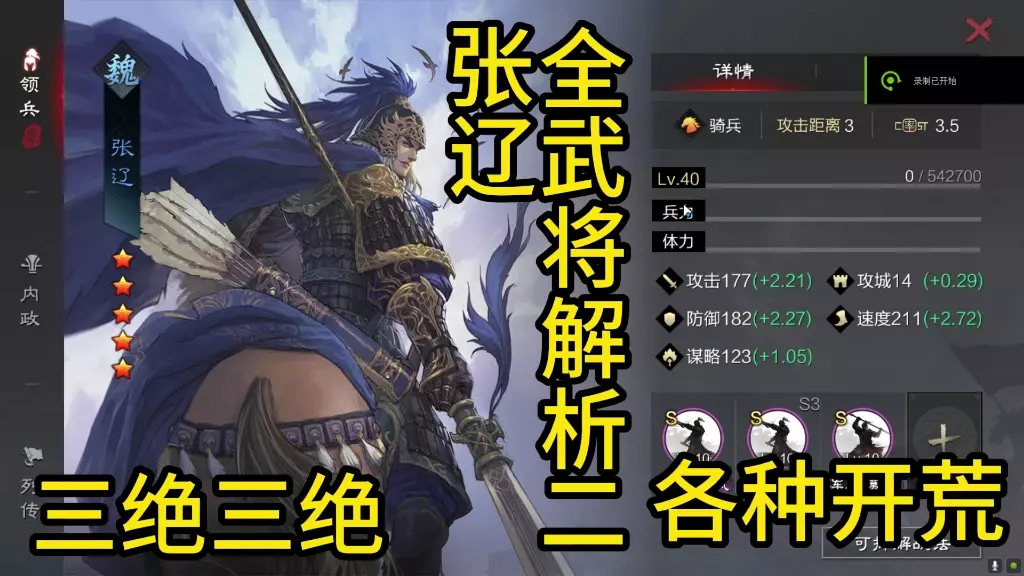 这是《率土之滨》的武将攻略,介绍了魏阵营五星武将张辽,他是游戏里的强力增伤武将,携带锋矢可增伤50以上,搭配战法攻其不备能将增伤拉到100加,还展示了张辽的属性面板。