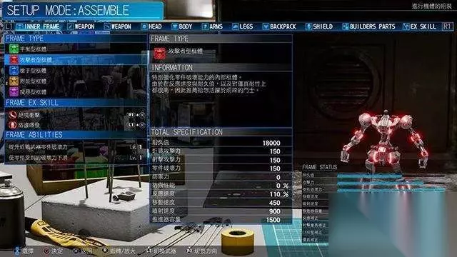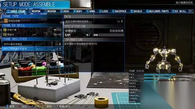 五种不同能力的框体 框体的被动技能一次可以装两个,并且根据出击次数来增加经验升级,升级后解锁更多的技能。随着技能等级的提高,才能逐渐凸显出各框体的特色。值的一提的是,由于框体的存在,本作中即使部件被击飞也是可以自由行动的,只是防御力会下降很多。