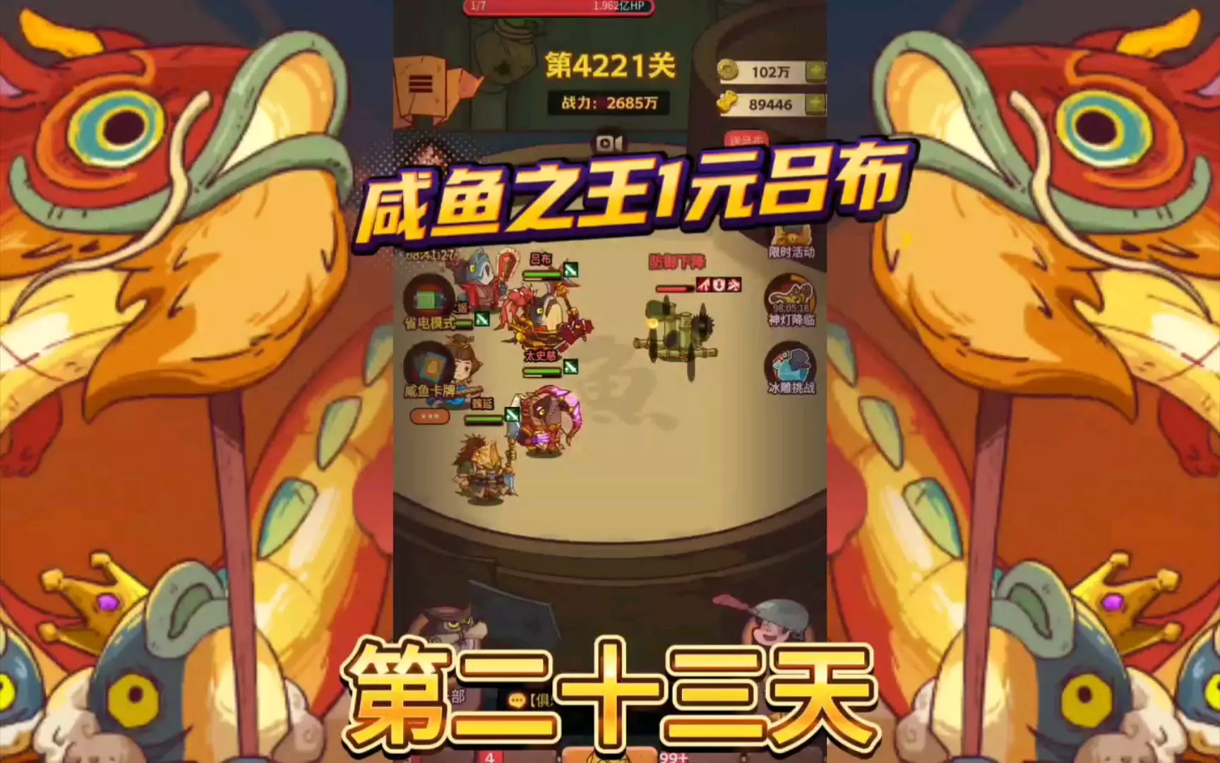 这是《咸鱼之王》的吕布6元起号第五十三天的攻略内容,展示了账号推关至6170关、挑战咸将塔65-5层的战斗画面,还呈现了咸主之争的对战场景,分享了该阶段的账号养成与关卡挑战情况。
