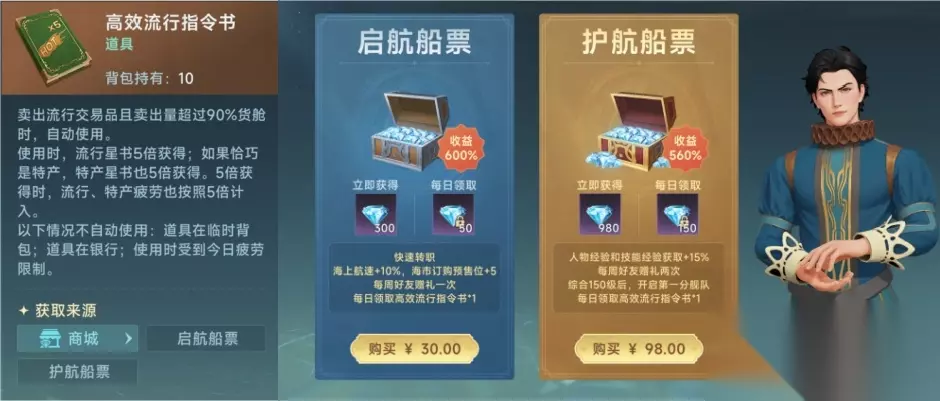 3.交易系统优化 a.新增“高效流行指令书”,使用后当货舱内流行物品全部卖出的时额外获得星书。购买启航船票、护航传票,每日可领取“高效流行指令书*1”;同时,启航船票增加海市订购、预售位+5的特权。