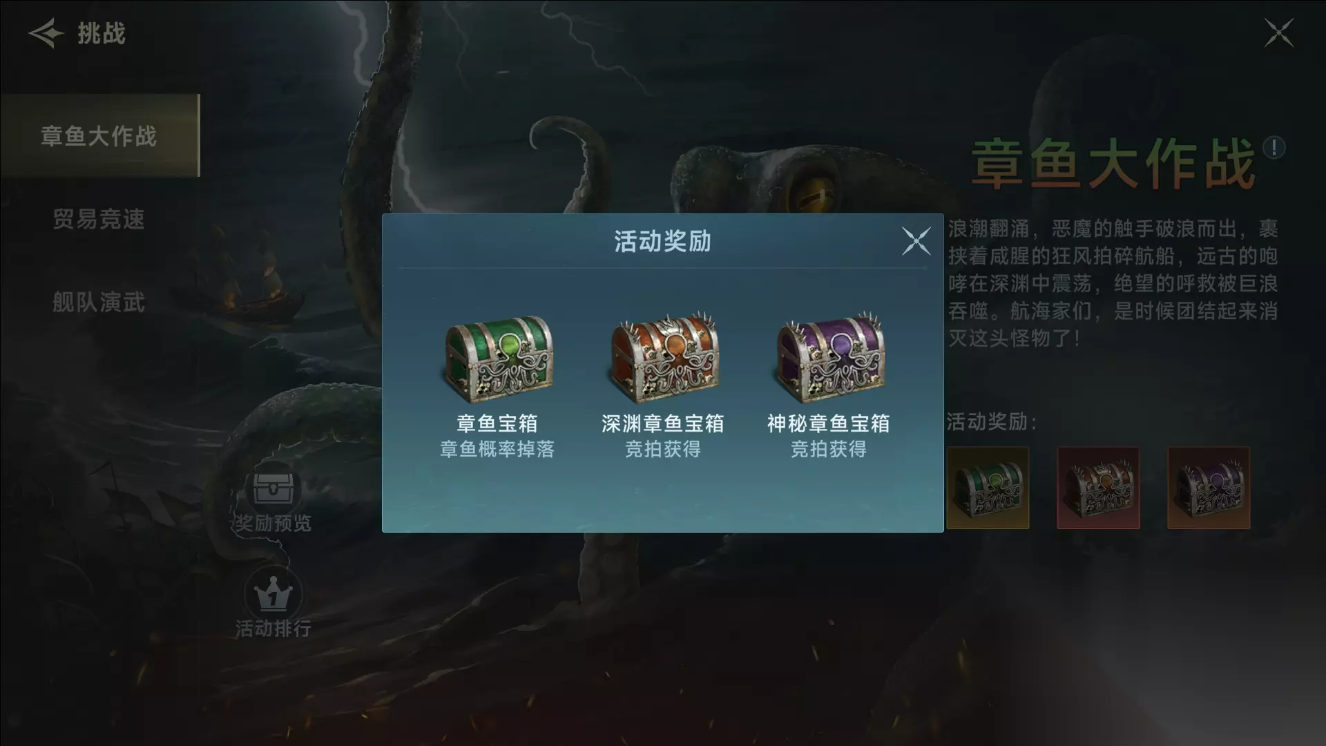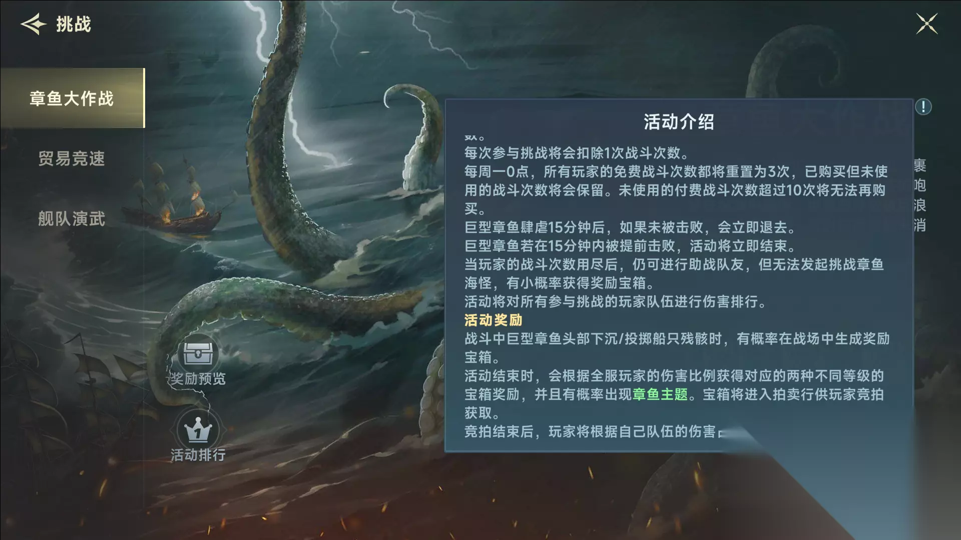 ⚔️ 玩法全流程详解 触手阶段 战场同时刷新5个触手 击破任意1个触手,全队获得增伤buff,效果持续至下一轮触手阶段 注意触手的碾击、穿刺、束缚绞杀技能! 章鱼头阶段 触手阶段结束后进入,章鱼头会召唤两类小章鱼 回血小章鱼:触碰章鱼头会为其回血,触碰玩家船只则造成伤害 减速小章鱼:缠住船只导致移动减速 以及,章鱼头使用触手投掷的投掷物,有概率转化为宝箱! 奖励与拍卖机制 战斗中巨型章鱼头部下沉/投掷船只残时,有概率在战场中生成奖励宝箱。 活动结束时,会根据全服玩家的伤害比例获得对应的两种不同等级的宝箱奖励,并且有概率出现章鱼主题。宝箱将进入拍卖行供玩家竞拍获取。