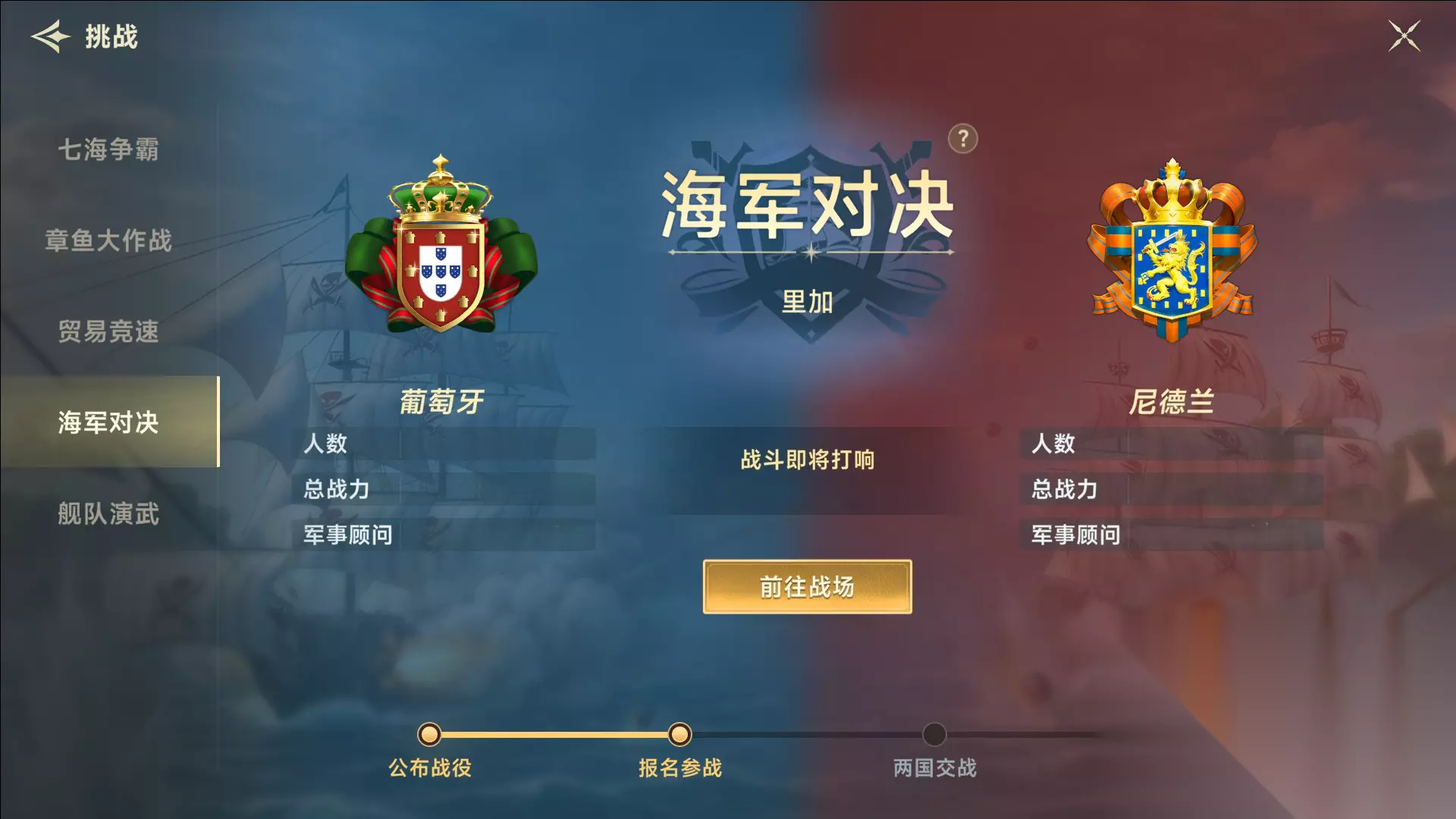 深海巨怪已苏醒,财富暗藏致命风险!船长们集结并肩,迎战章鱼大作战,以胆略破局! 二、全新国家GVG玩法 【海军对决】 皇家海军专属港口抢占对决来袭!1v1车轮战热血开打,争夺港口占有度、赢取资源收益,硬核海上对抗,用实力掌控港口霸权,国家港口掌控力的核心玩法,邀你并肩开战! 首次七海争霸结束后,国家可以向其他国家的港口发动突袭,抢占特定港口的占有度。 每个国家每周可以发动1次抢占,最多被其他国家进行2次抢占。对战可预约时间为:周一、周三、周五晚上20点。 抢占流程