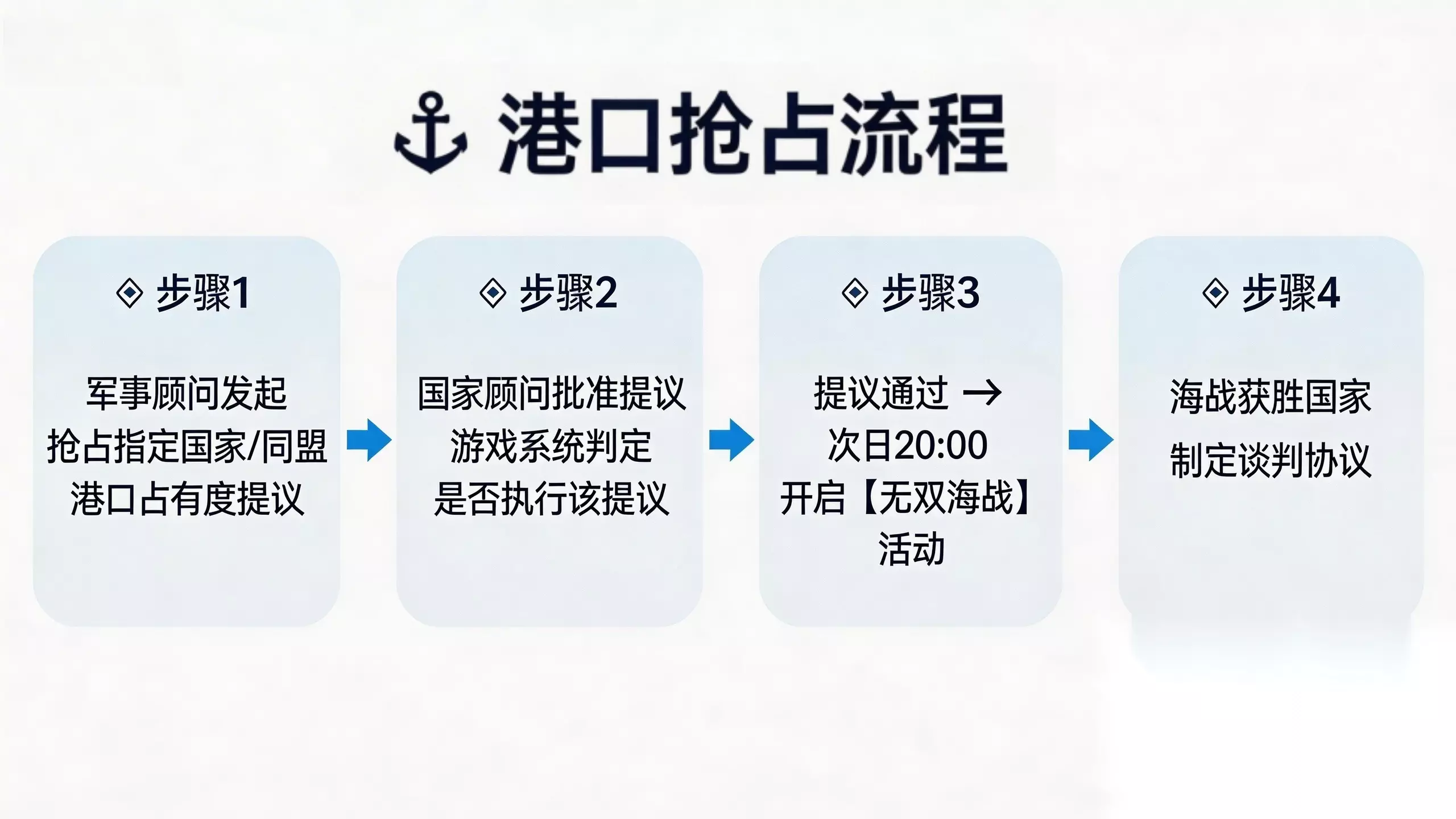 胜负结算:占有度+资源,输赢皆有反馈 1. 抢占方胜:掠夺被抢方港口占有度(最高30%)。 2. 抢占方败:将丢失部分国库资金,补偿给被抢占方。 3. 额外加成:根据国家之间的胜负关系,净负场次多的国家将会获得战力加成。
