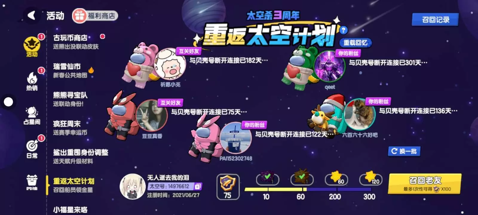 三周年的「重返太空计划」里,看着那些「与贝壳号断开连接」的天数,182天、301天、136天…心里满是感慨。那些一起吵吵闹闹盘逻辑、一起为了赢互相配合的人,终究散落在不同的时光里。但还好,我还守在这片太空里,守着我们曾经的回忆。