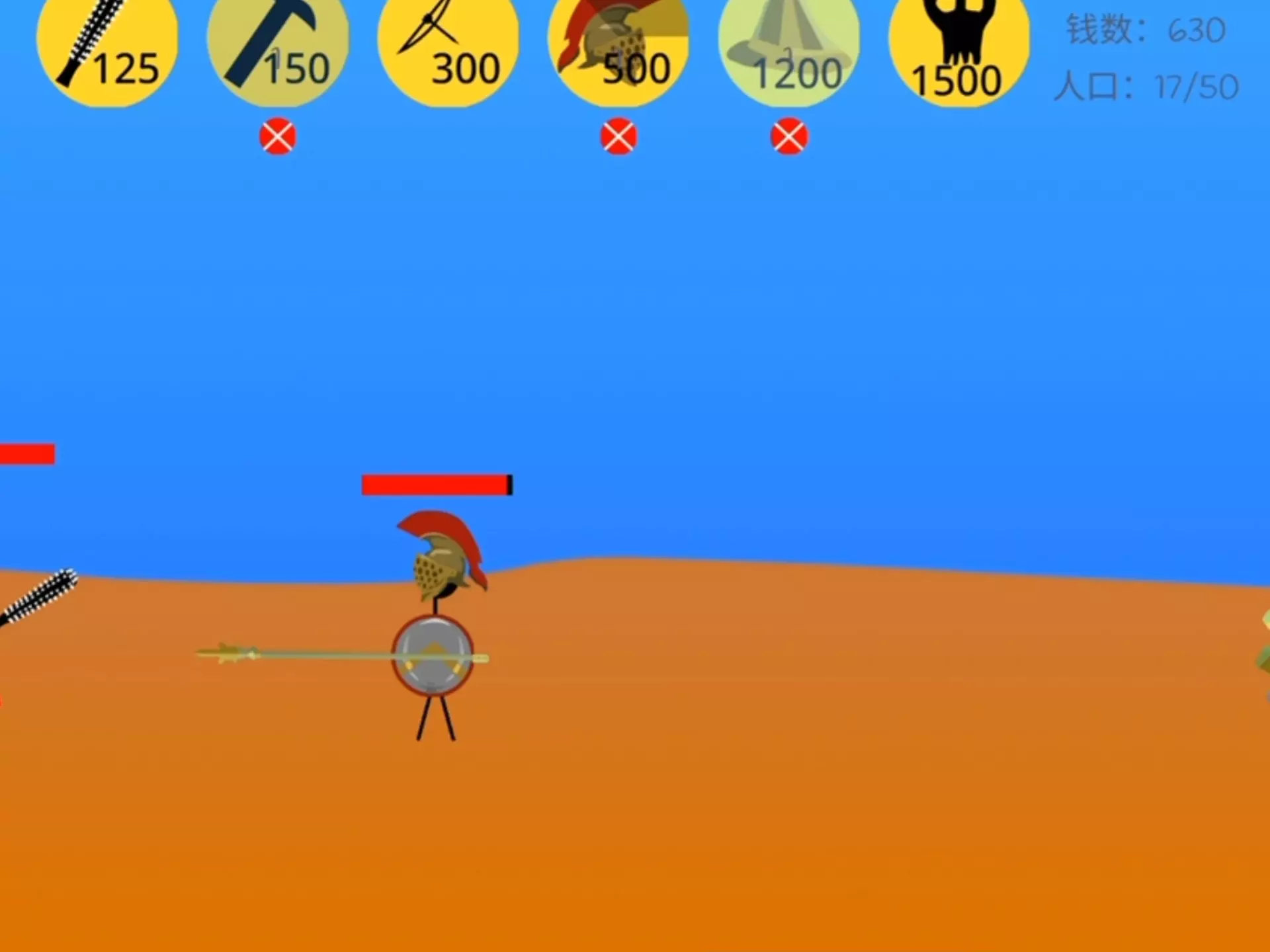 这是一款自制的骨骼动画火柴人战争游戏,有经典游戏、每周任务等玩法,需双线作战守住阵地,此次对战的是76级、伤害为8+2x的敌军弓箭手,游戏内可招募不同兵种作战。