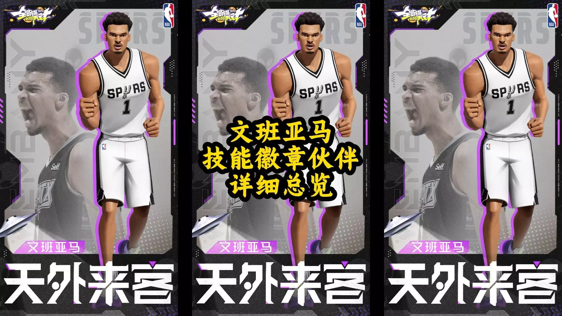 这是一篇关于篮球游戏《全明星街球派对》的文班亚马初体验内容,展示了玩家使用文班亚马在游戏3v3对局中的实战过程,呈现了游戏内的攻防、得分等对战场景。