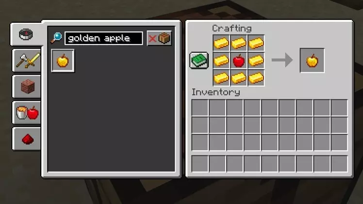 要制作金苹果,你需要金锭和一个苹果。这听起来很显而易见,但配方有时会变得复杂,所以这个配方简单点挺好的。用制作网格包围后者,就完成了。如果你不太喜欢制作,也可以在各种地方捡到金苹果作为宝藏——怪物房间、试炼室、海洋遗迹、林间豪宅、要塞、冰屋、沙漠金字塔等等。