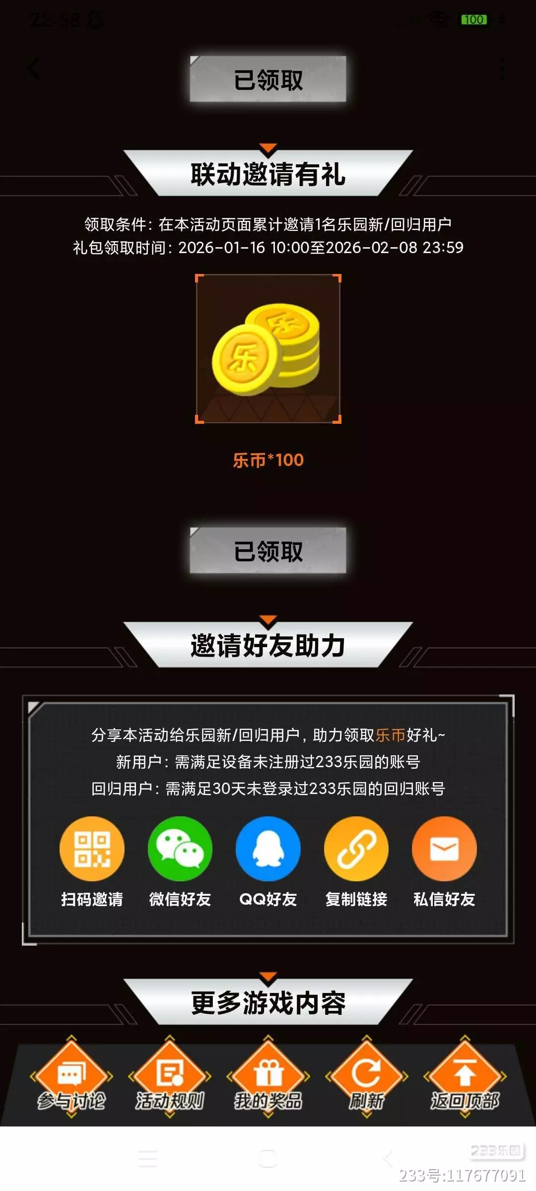 2.联动邀请1位新回归用户获得100乐币