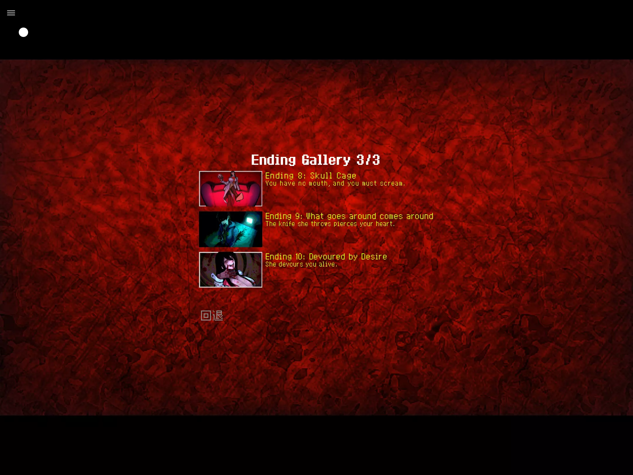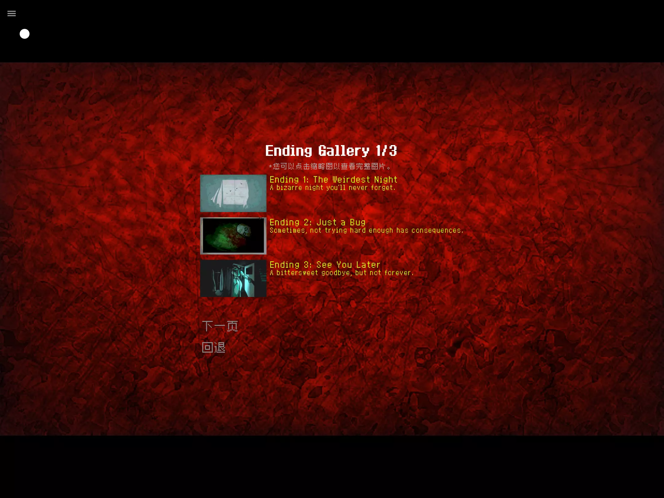 打完全结局差不多是花了两个多小时,为了省时间存了二十四个档,结果发现某些结局一定要从头开始做存档没用(咬牙切齿ing),结局2;3;5打的巨折磨,想找攻略还发现没有😭😭😭,接下来分享一下每个选项的作用 选项作用 1.得知消息后:沉默(END1)/拒绝开门(失败)/锁门再开(达成END5必要条件;掉好感) 2.问讯礼物:科学家(加好感)/朋友(无变化)/你(失败) 3.全纸条:达成END235必要条件,其他结局看无效,会导致END7达成失败 4.电视:爱情片(无效果)/恐怖片(加好感)/机器人大战(失败) 5.上楼:蟑螂(失败)/无(加好感)/老鼠(无效果) 6.聊天:聊我(无效果)/聊她(见分支6.1)/随便聊(+1好感) 6.1.分支:想了解(好感+1;见分支6.2)不想了解(失败) 6.2.分支:为何是我;为何是Mrs(无效果)/你是何物(4选项+1好感) 7.做饭:我(失败)/甜点(END3;7必要条件)/披萨(+1好感) 8.拿刀:拿(END4589;10必要条件)/不拿(END367必要条件) 9.是否放刀:放(END8)/不放(END9;10) 结局达成方法 END1(开局沉默) END2(纸条全看,出现错误选项) END3(纸条全看,无错误选项) END4(不拿刀,好感未满) END5(开局门窗报纸全看,纸条全看,拿刀,其他选项全错) END6(不拿刀,好感达标但未满) END7(不看门窗,不看纸条,不拿刀,事件6.2要做完,其他选项全对) END8(拿刀,选择放下刀) END9(拿刀捅人,好感还未达标) END10(拿刀捅人,好感达标) 呼~感觉想写了篇小作文,如果这份攻略对你有帮助,可以评论晒自己的全结局收录图,同时点一个免费的赞,谢谢大家QAQ