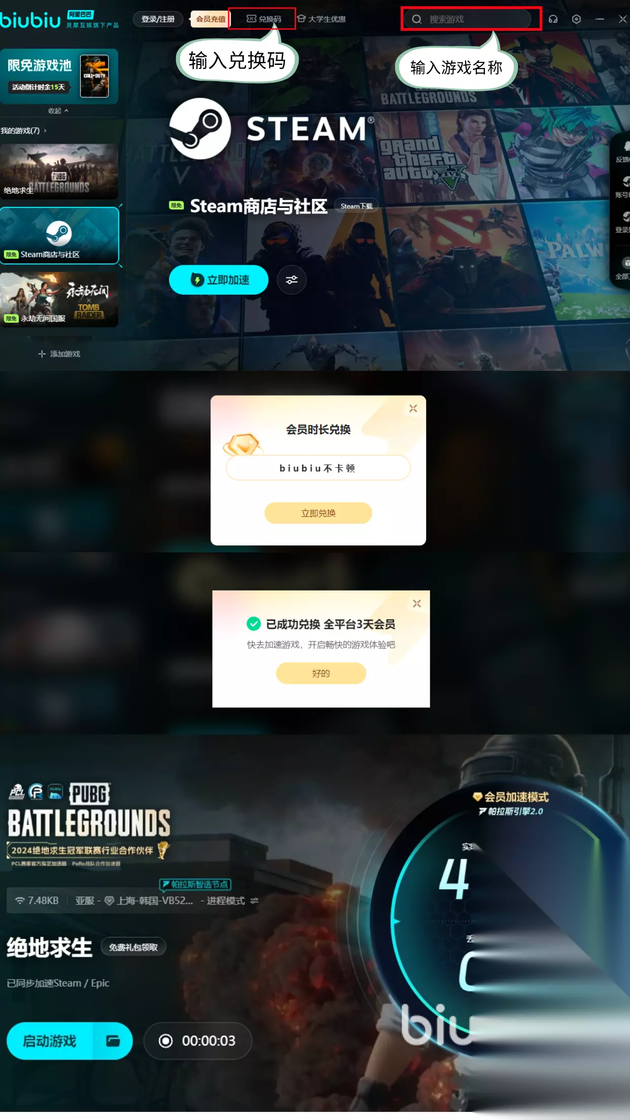 现在下载使用还可享受超多福利,如果是新用户登录,立刻就有24小时免费加速时间可以享受,若不是新用户也没有关系,平台还给小伙伴们提供了三天的加速时长,每个人都可以用【biubiu不卡顿】兑换一次三天体验时间。