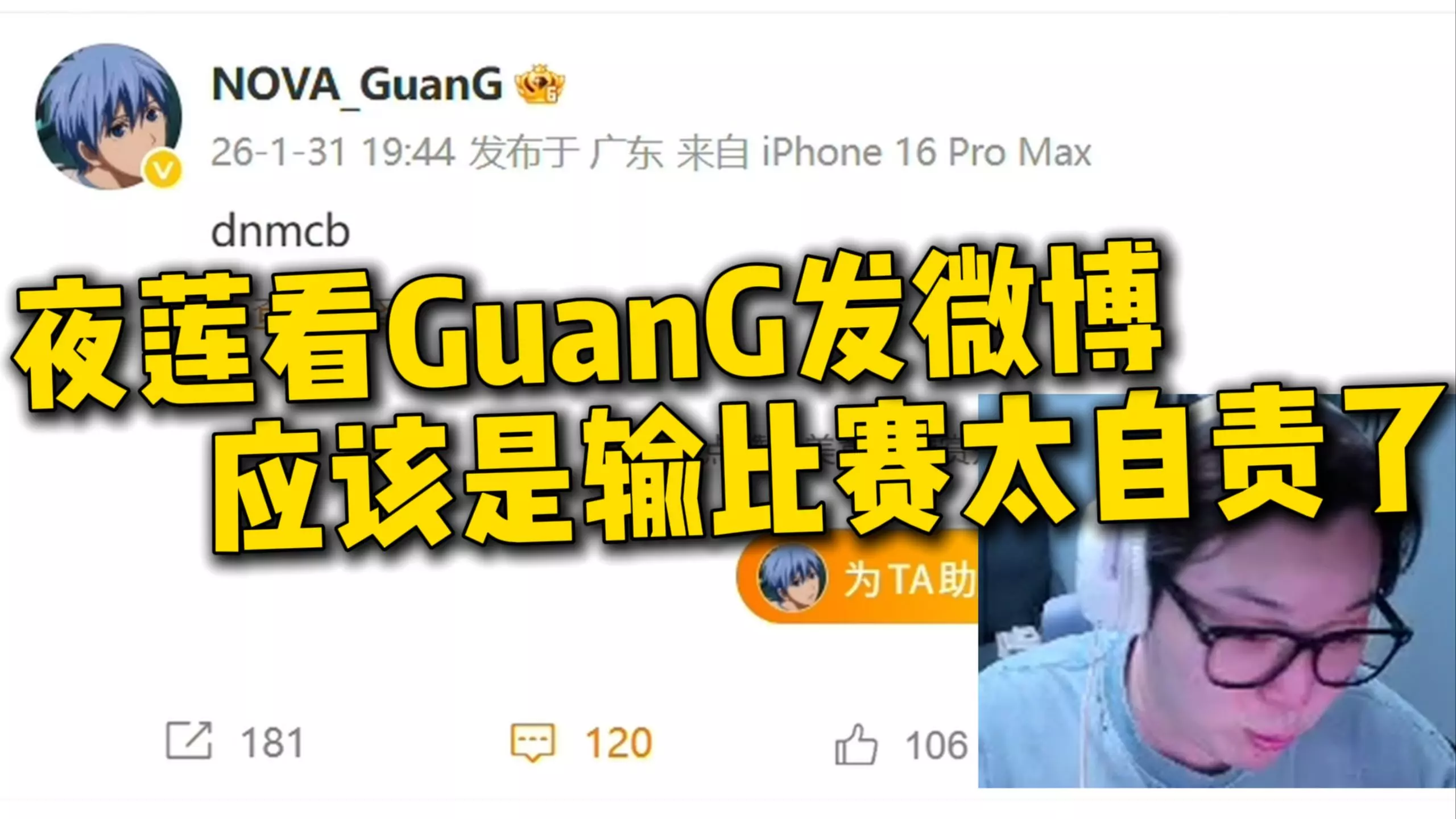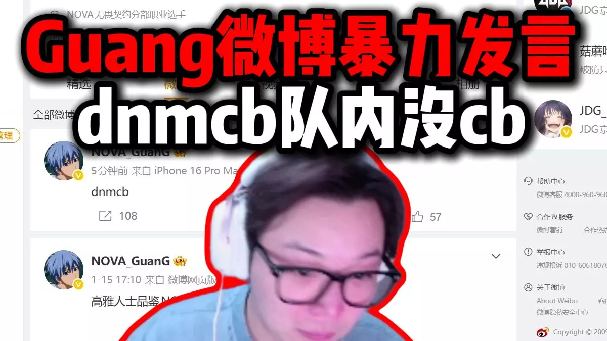 【夜莲】NOVA全球首飞后Guang微博暴力发言:dnmcb队内没cb,可能输比赛有点自责没打好