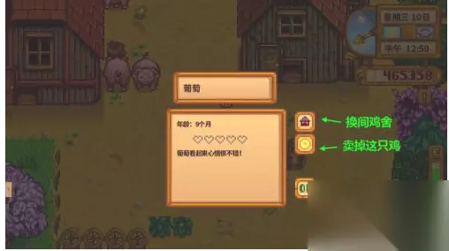 最后小编教你如何换鸡舍和卖鸡: 点击任意一只鸡,然后如下图所示的两个图标就是换鸡舍和卖鸡,换鸡舍首先要保证那间鸡舍有空位否则没法换,卖鸡是不可撤销的操作,要慎重考虑。