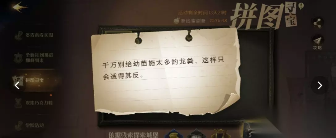 哈利波特魔法觉醒千万别给幼苗 【拼图攻略】 拼图线索:千万别给幼苗施太多的龙粪,这样只会适得其反。