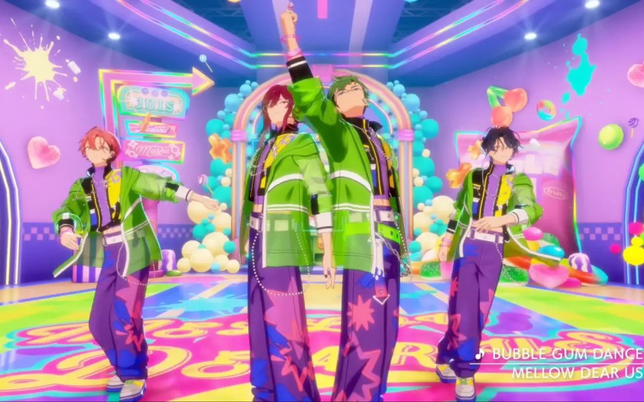 这是《偶像梦幻祭》相关内容,展示了组合MELLOW DEAR US演唱《Dear World》的舞台片段,画面呈现了成员们的舞台表演瞬间,还搭配趣味弹幕,调侃仿佛成员们都是原唱。