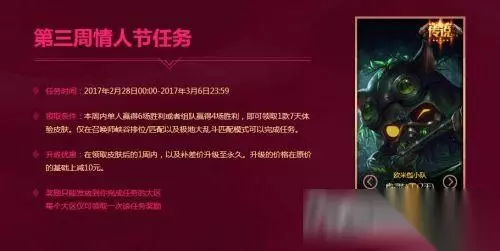 任务时间:2017年2月28日00:00-2017年3月6日23:59 领取条件:本周内单人赢得6场胜利或者组队赢得4场胜利,即可领取1款7天体验皮肤。仅在召唤师峡谷排位/匹配以及极地大乱斗匹配模式可以完成任务。