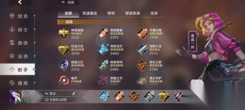 出装推荐方面,前期首选刀锋之翼,兼顾攻速与基础普攻伤害,提升对线压制力;蔷薇箭袋提供双速加成(攻速+移速),属核心必出装;神圣审判强化普攻附伤能力并补充攻速;狂放之力为关键暴击装,但需避免与扭曲之刃同期合成,否则二者被动效果相互稀释;最终一件装备可根据战局灵活选择:平衡支配者提升容错与续航,破天增强穿透效率,若敌方控制密集或生存压力较大,绯红之刺亦是优质保命替代方案。