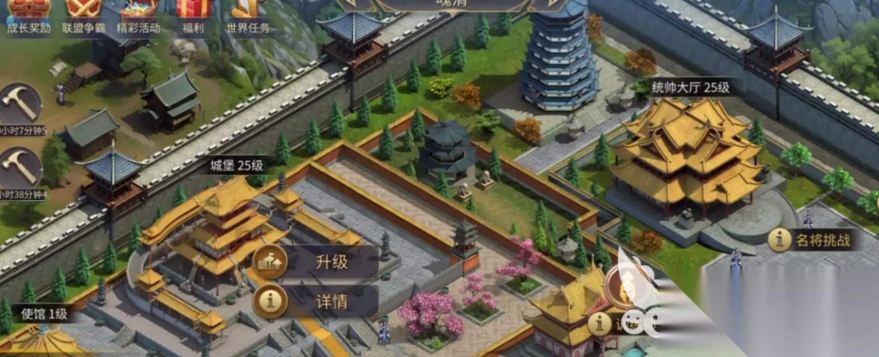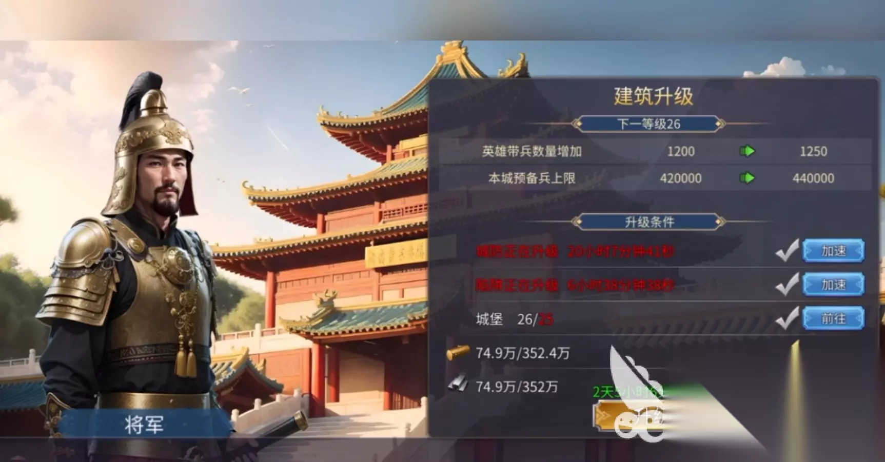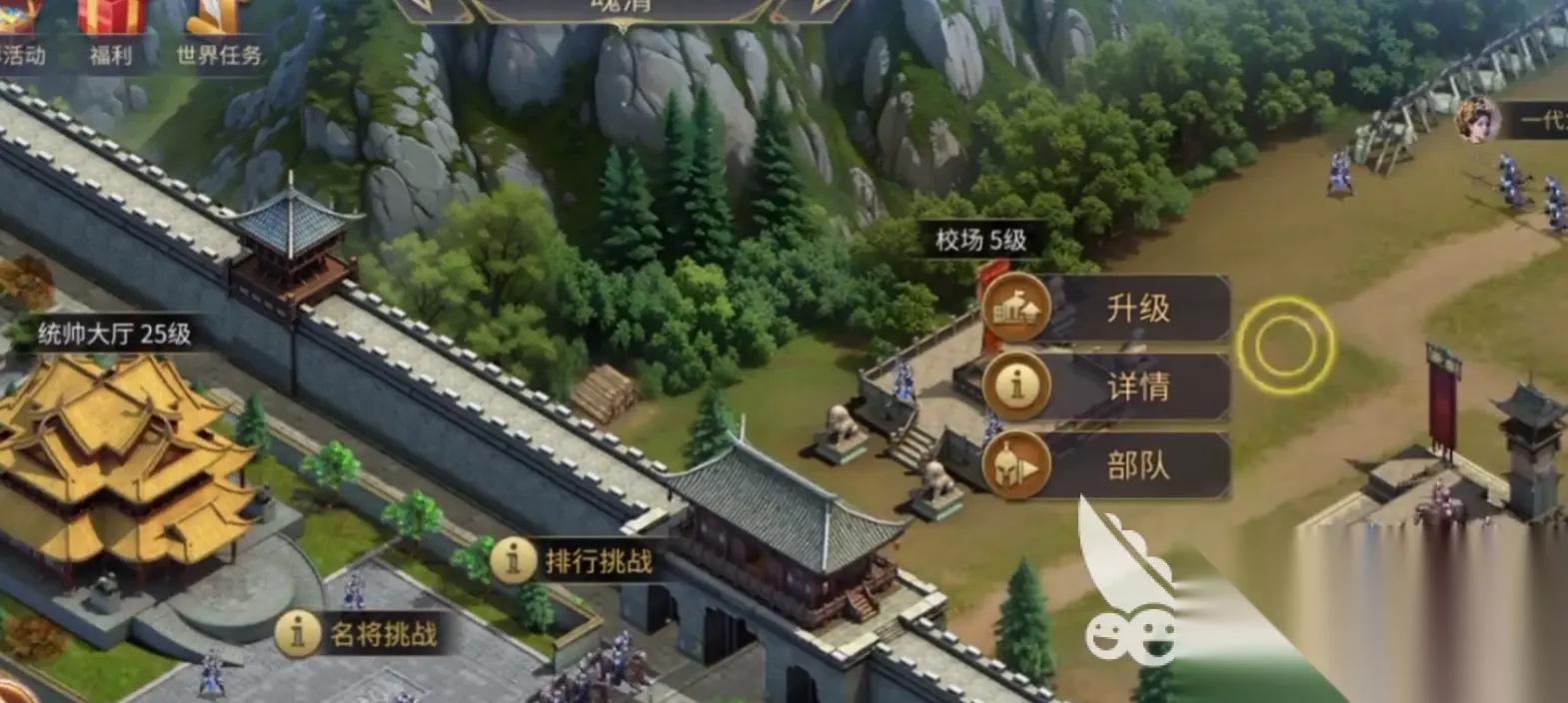 如果升级完主城和其他资源建筑大家的资源充足的话,就可以将统帅大厅,校场和兵营这三个建筑进行升级,因为它们是直接和我们的战力挂钩的。而且在前期我们的任务大多数都是清野怪,所以兵营的升级也是势在必行的,升级之后可以加快我们招募兵力的速度。另外,前期开荒阵容的话推荐大家尽量用四星的武将,比如三弓两步是比较稳妥的,很适合用来前期开荒。