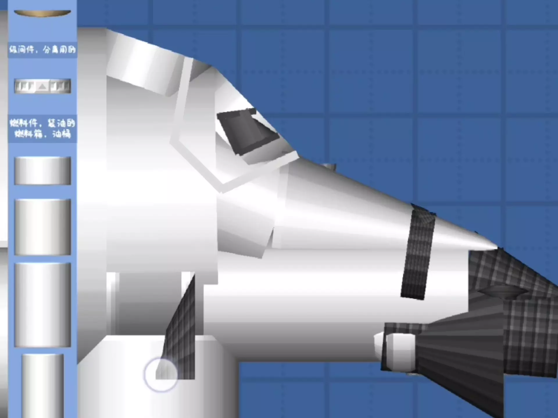 这是为SFS新人打造的航天飞机教程,无需修改文件,操作简单,能制作出美观的航天飞机,教程展示了航天飞机部件的搭建界面,帮助新人上手制作。