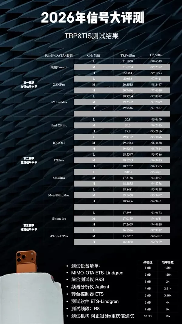 快科技2月1日消息,近日,博主“阿正很硬”联合重庆信通院对当下热门的手机进行了信号测试,结果显示iPhone的表现非常的差。具体来说,2026年手机信号大评测TRP和TIS测试梯队排名如下:第一梯队(增强信号水平):荣耀Power2、vivo X300 Pro和REDMI K90 Pro Max;第二梯队(主流信号水平):OPPO Find X9 Pro、IQOO 15、小米17 Ultra、三星S25 Ultra和华为Mate 80 Pro Max;第三梯队(标准信号水平):iPhone 16e和iPhone 17 Pro。上述博主还对这个榜单进行了一些数据上的说明,比如通常情况下TRP发射功率越大越好,但越大也会面临功耗、SAR辐射问题、法规问题、干扰问题,TIS呢就是总全向天线灵敏度,这个值越小越好。例如-99dBm比-98dbm小。有网友看完之后纷纷表示,想到过iPhone的信号表现差,但是没想到会这么差。不过还有一些人表示,华为在这个信号测试中没有登顶第一梯队有点没想到,按说这不应该啊,毕竟很多基站都是华为做的,配合自家的手机那都是超神一样的存在(基带也是自己做的)。