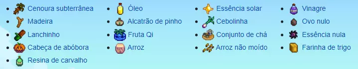 Stardew Valley的已婚npc指南 继续 在星露谷,我们有45个npc(12个面对面,22个非面对面,11个不露面)。本指南旨在向您展示理想的礼物以及每个可用于婚礼的npc的位置。 本指南中的所有信息都在这里[pt.stardewvalleywiki.com] 万能礼品 在星露谷,所有村民都有他们的不同和相似之处,这些相似之处都在大家都喜欢(或者至少是最喜欢)的万能礼物中 作为套装一部分的物品在图片中 万能礼品分为: 普遍的爱:这些是每个人都喜欢的礼物(或者至少是其中的绝大多数,例如。:棱柱形碎片是一种普遍的爱,但Haley讨厌从玩家那里收到一个作为礼物) 此集合中包含的项目: