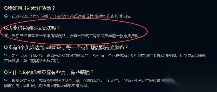 战争学院的荣耀你们开到了几折?有开到限定的吗? 关于这个活动老皮也不用多讲什么,大伙都是比较清楚的了,不过有一个开限定的技巧依旧还能用,如果达到此条件的,可以试试老皮所说的技巧! 另外再说一点,这个活动比较难开出新皮肤,所谓新皮肤也就是那种上线不足半年或者不足一年的皮肤,也可以叫新皮肤的。这个活动开出来的基本上是老皮肤的多。 活动奖励: 若某个英雄的成就达到5级,即可获得: A. 该英雄部分皮肤的折扣购买(仅可购买1个) B. 两款守卫皮肤 如何提高抽取限定皮肤的几率? 这里大家注意,获得抽取限定皮肤的前提条件是你要有该英雄的全部非限定皮肤并且该英雄成就要是5级。然后你才有几率能抽出该英雄的某一款限定皮肤,记住了是有几率,这也不是老皮拍脑袋说的,这是官方自己说的。