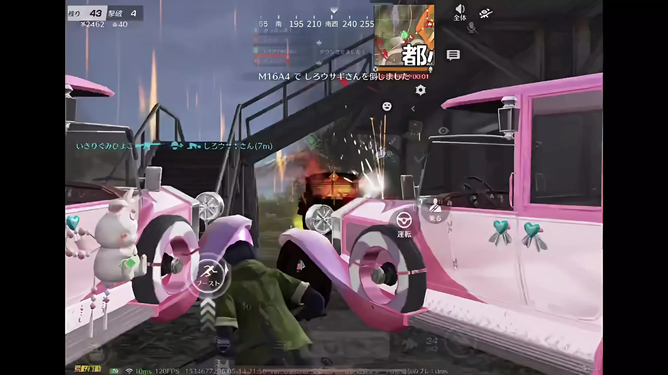 这是日服《荒野行动》的游戏内容帖,展示了玩家在室内、野外等场景的战斗画面,传达永远尊重对手的游戏理念,还提及每百粉将发布一个教程视频。
