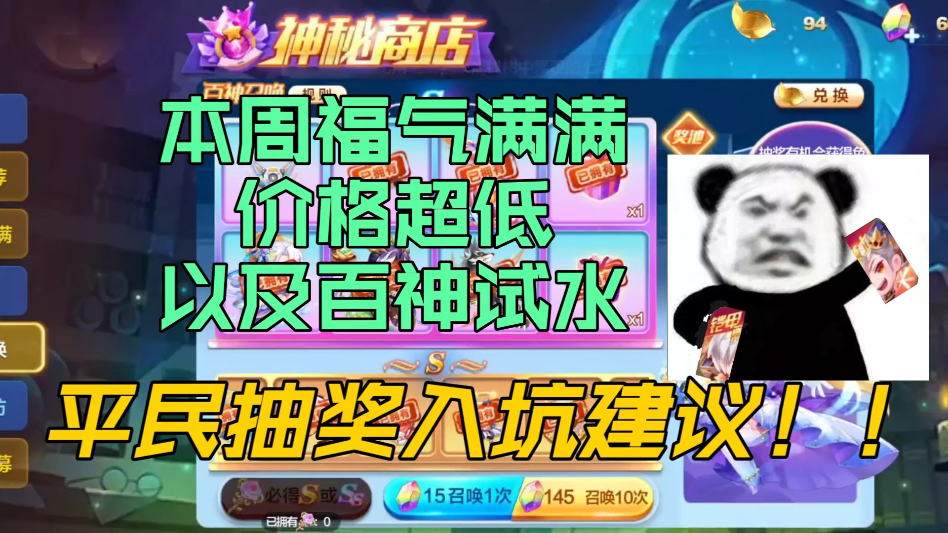 本周的活动打折 平民最佳选择 福气价格很低了 我自己小号是四百石头搞定四个币 概率还是非常不错的 而且奖励除了个别像东海龙王这种搅屎棍其他都还不错 百神和刮刮乐…