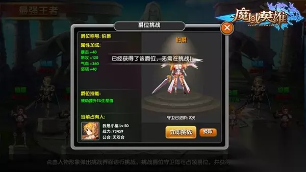 玩家每天挑战守卫的次数并没有限制,但在每次挑战失败后,玩家需要等待5分钟才能再次发起挑战,若挑战成功玩家便能够获得该爵位。同时每个爵位只要成功被挑战一次就会得到进阶,进阶之后爵位所提供给的属性也会得到加强。 已经拥有爵位的玩家不能挑战当前爵位或当前爵位以下的守卫。如果果你的爵位被其他玩家成功挑战,当前拥有此爵位的玩家也会失去次称号和属性加成。 通过小编的这番讲解,大家有没有对《魔域英雄》中的最强王者系统有了一个更深入的了解了呢?