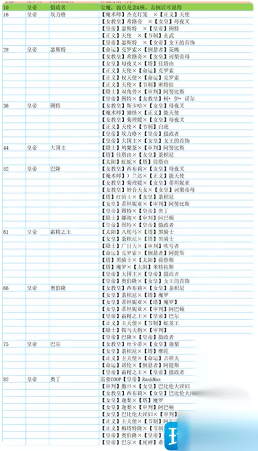 皇帝 摄政王(宝魔) 不可合成 埃力格 ·魔术师Lv2・杰克灯笼×正義Lv9・天使 ·正義Lv9・天使×節制Lv11・木叶天狗 ·正義Lv9・天使×顾问官Lv12・奇魂 瑟坦特 ·正義Lv9・天使×魔术师Lv23・睡魔 ·正義Lv14・大天使×顾问官Lv22・和魂 ·正義Lv14・大天使×節制Lv22・持国天 ·太阳Lv16・朱雀×信念Lv21・凤凰 图特 ·女教皇Lv26・伊西丝×女帝Lv26・拉弥亚 ·魔术师Lv23・睡魔×正義Lv29・权天使 ·倒悬者Lv26・建御名方×命运Lv27・可罗索 ·魔术师Lv28・克伦佐×正義Lv29・权天使 巴隆 ·顾问官Lv32・单卡拉比×正義Lv41・能天使 ·审判Lv34・阿努比斯×女帝Lv40・诃梨帝母 ·塔Lv37・贝尔芬格×太阳Lv39・米特拉斯 ·命运Lv35・拉克西斯×正義Lv41・能天使 霜精之王 ·塔Lv51・赛特×太阳Lv53・象头神 ·女教皇Lv50・妙音天女×女帝Lv56・蒂妲妮亚 ·魔术师Lv48・兰达×正義Lv58・默基瑟德 ·塔Lv51・赛特×女帝Lv56・蒂妲妮亚 奥伯隆 ·塔Lv59・黑骑士×女帝Lv63・迦梨 ·审判Lv59・トランぺッター×女帝Lv63・迦梨 ·塔Lv59・黑骑士×太阳Lv66・羽蛇神 ·節制Lv55・那伽之王×正義Lv68・主天使 巴力 ·审判Lv64・八岐大蛇×隠者Lv70・罗瓦 ·魔术师Lv63・佛钮司×正義Lv72・座天使 ·正義Lv68・主天使×命运Lv69・吉祥天 ·太阳Lv66・羽蛇神×塔Lv73・魔罗 奥汀 ·正義Lv81・尤利尔×魔术师Lv83・斯尔特 ·女教皇Lv83・西布莉×女帝Lv85・巴比伦大银妇 ·女帝Lv81・威灵×审判Lv87・米迦勒 ·审判Lv82・湿婆×隠者Lv86・法夫纳