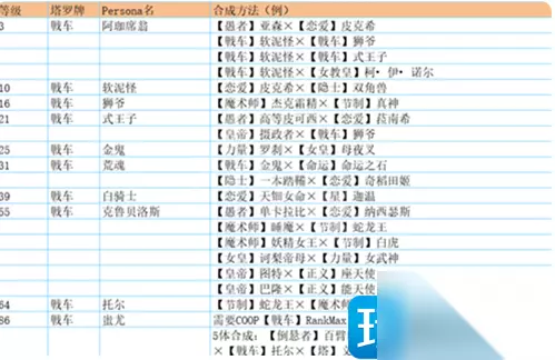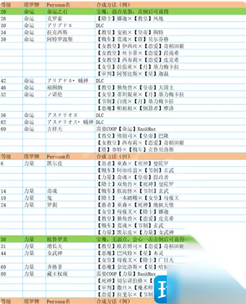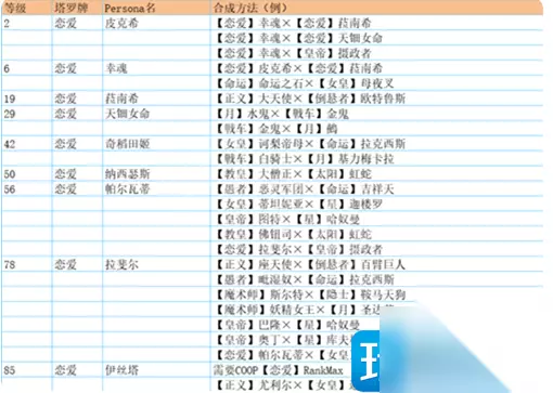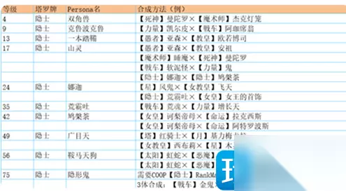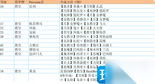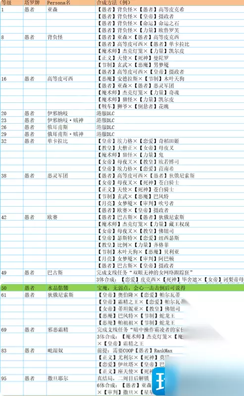 塔 贝尔芬格 ·愚者Lv8・背负怪×倒悬者Lv9・花魂 ·法王Lv9・比利士×星Lv11・木灵 ·力量Lv6・凯尔皮×皇帝Lv16・埃力格 ·月亮Lv12・阴魔罗鬼×皇帝Lv16・埃力格 红骑士 ·太阳Lv34・闪电鸟×女帝Lv40・诃梨帝母 ·星Lv36・迦温×法王Lv40・大僧正 ·愚者Lv38・恶灵军团×倒悬者Lv42・百臂巨人 ·皇帝Lv36・图特×月亮Lv43・基力梅卡拉 祸津伊邪那歧(DLC) ·愚者Lv42・欧赛×倒悬者Lv42・百臂巨人 祸津伊邪那歧・贼神(DLC) ·顾问官Lv44・阿难陀×恋愛Lv48・纳西瑟斯 赛特 ·女教皇Lv26・伊西丝×审判Lv34・阿努比斯×皇帝Lv36・图特×太阳Lv47・荷鲁斯 黑骑士 ·女帝Lv40・诃梨帝母×太阳Lv43・虹蛇 ·愚者Lv42・欧赛×倒悬者Lv42・百臂巨人 ·力量Lv44・女武神×皇帝Lv52・巴隆 ·法王Lv52・御社宫司神×星Lv52・迦楼罗 魔罗 ·星Lv52・迦楼罗×法王Lv67・毘沙门天 ·女帝Lv56・蒂妲妮亚×太阳Lv66・羽蛇神 ·月亮Lv60・莉莉丝×皇帝Lv61・霜精之王 ·皇帝Lv61・霜精之王×力量Lv64・哈奴曼 义经 ·戦車Lv18・式王子×隠者Lv35・荒霸吐×信念Lv54・大国主×顾问官Lv57・八咫鸟×魔术师Lv86・经津主 摩驼 ·力量Lv64・哈奴曼×皇帝Lv82・巴力 ·顾问官Lv71・狄俄尼索斯×恋愛Lv78・拉斐尔 ·月亮Lv70・拜亚基×皇帝Lv82・巴力 ·法王Lv76・黄龙×星Lv80・斯拉欧加