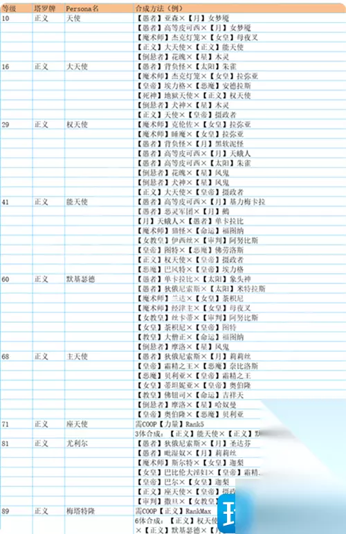 正义 天使 ·愚者Lv1・亚森×月亮LV7・女梦魔 ·月亮Lv7・女梦魔×愚者Lv8・背负怪 大天使 ·倒悬者Lv9・花魂×星Lv11・木灵 ·愚者Lv8・背负怪×月亮Lv12・阴魔罗鬼 ·法王Lv9・比利士×顾问官Lv12・奇魂 权天使 ·顾问官Lv12・奇魂×法王Lv17・欧若博司 ·愚者Lv16・高等皮克希×太阳Lv16・朱雀 ·倒悬者Lv9・花魂×星Lv23・风鬼 能天使 ·女教皇Lv26・伊西丝×审判Lv34・阿努比斯 ·法王Lv25・安祖×命运Lv35・拉克西斯 ·女帝Lv26・拉弥亚×皇帝Lv36・图特 ·魔术师Lv28・克伦佐×命运Lv35・拉克西斯 默基瑟德 ·命运Lv39・阿特罗波斯×魔术师Lv43・妖精女王 ·女帝Lv40・诃梨帝母×魔术师Lv43・妖精女王 ·法王Lv40・大僧正×顾问官Lv44・阿难陀 ·愚者Lv42・欧赛×太阳Lv43・虹蛇 主天使 ·女帝Lv56・蒂妲妮亚×皇帝Lv61・霜精之王 ·女教皇Lv53・丝卡蒂×审判Lv64・八岐大蛇 ·恶魔Lv58・巴风特×皇帝Lv61・霜精之王 ·女帝Lv56・蒂妲妮亚×魔术师Lv63・佛钮司 座天使 ·法王Lv67・毘沙门天×命运Lv69・吉祥天 ·愚者Lv67・邪恶霜精×月亮Lv70・拜亚基 ·法王Lv67・毘沙门天×顾问官Lv71・狄俄尼索斯 ·星Lv68・婆苏吉×倒悬者Lv73・马卡布 尤利尔 ·顾问官Lv71・狄俄尼索斯×法王Lv76・黄龙 ·审判Lv75・阿巴顿×女教皇Lv77・斯卡哈 ·信念Lv76・库夫林×女教皇Lv77・斯卡哈 ·恶魔Lv74・奈比洛斯×皇帝Lv82・巴力 梅塔特隆 ·正義Lv29・权天使×正義Lv41・能天使×正義Lv58・默基瑟德×正義Lv68・主天使×月亮Lv81・圣达芬×审判Lv87・米迦勒